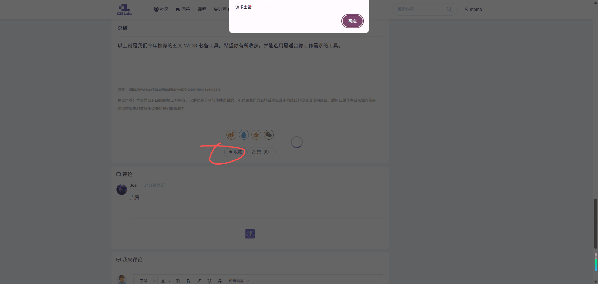 点击 收藏或者点赞按钮后,弹出报错窗口