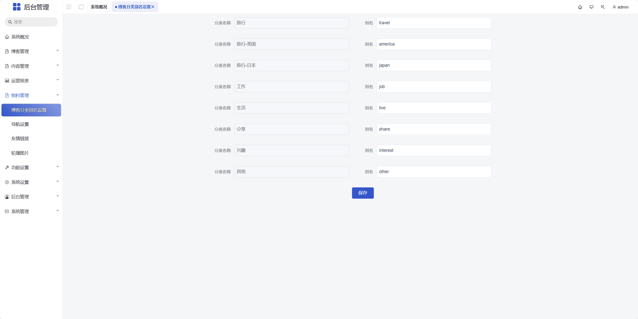 • 物料管理->博客分类别名设置->填写博客分类别名