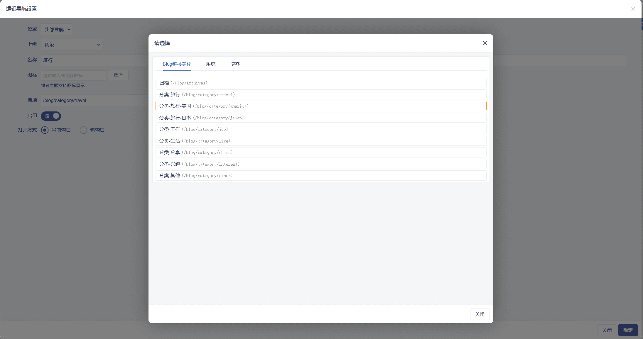 • 导航设置或其他设置页面有链接选择的地方选择“Blog链接美化”tab页下的链接