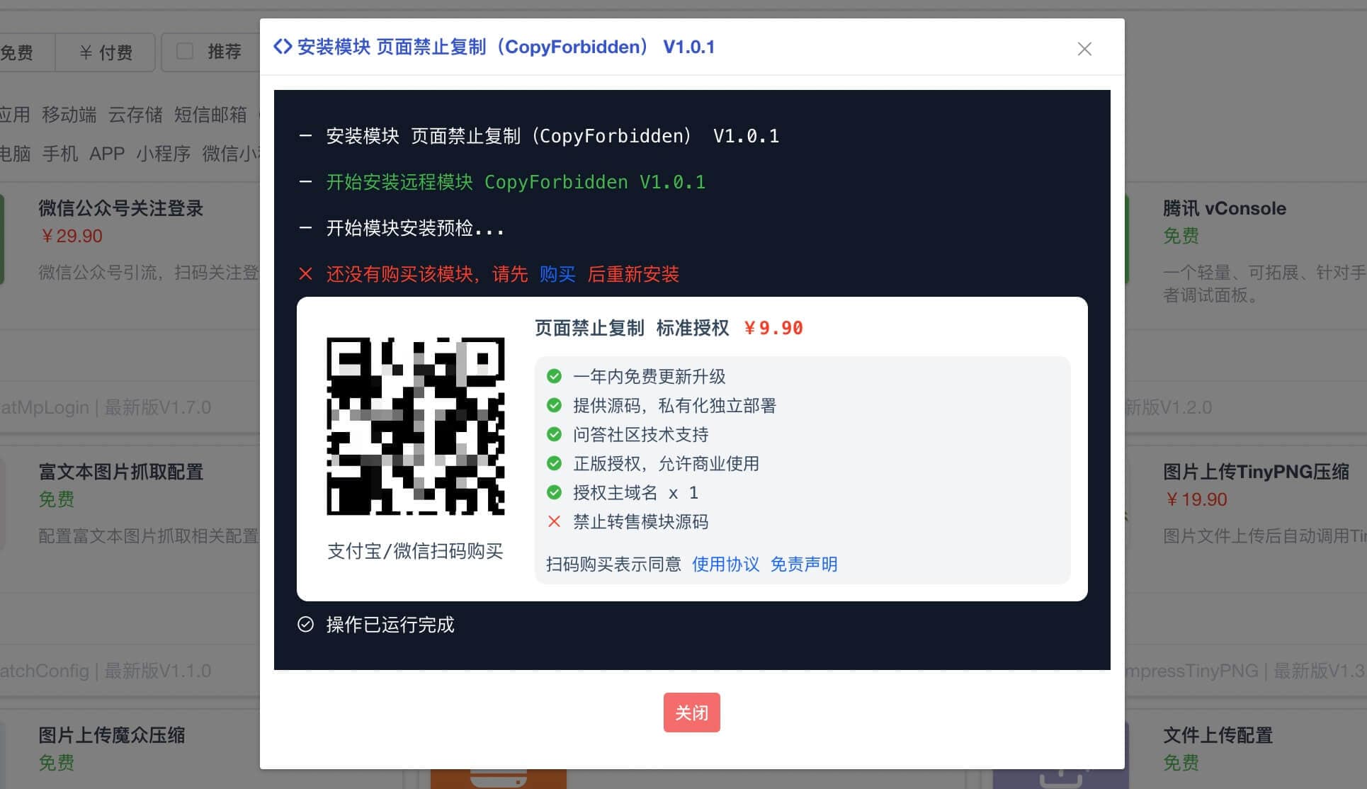 为方便大家后台模块的安装,系统支持后台一键微信/支付宝扫码购买功能。