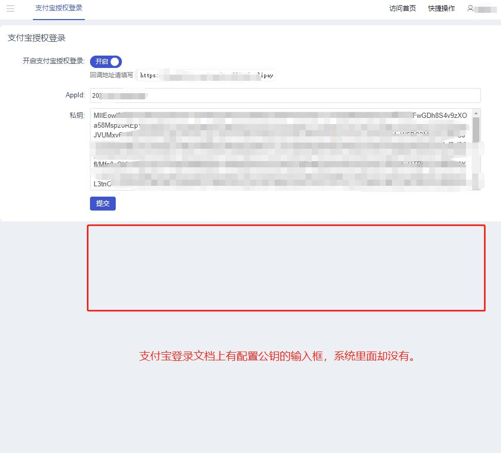2看到文档第7步,登录授权那边还有支付宝公钥要填写,但是实际系统里面登录这边没有填这个支付宝公钥的地方。
